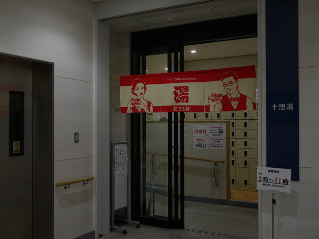 ガラス扉の自動ドアという入口に花王の暖簾が掛る。中に入れば広くはないバリアフリーのスロープと広くはない靴脱ぎ場。下足箱はグレーのスチール製が置かれている。