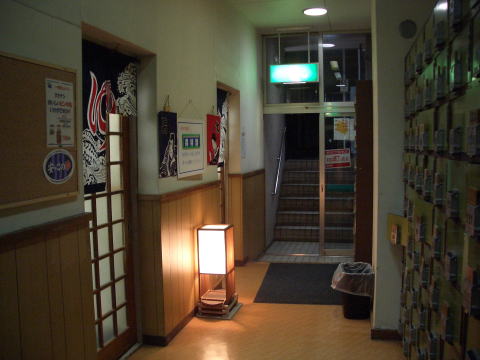 表通りと裏通り、双方から、階段を下りると靴脱ぎがある。下足箱の錠は松竹。男湯と女湯の間には、行灯方の照明が置かれ、コンクリートの空間ながら和みを出している。