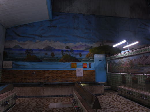 浴室は、幅3間半、奥行4間。天井はくすんだ白ペンキ塗りの2段型。床のタイルは茶色と白 の斑の長方形のものを縦横に組む珍しいもの。全体的にくすんだこの浴室に合っている。洗い 湯を流す溝は厚手の白磁のものだけど縦に割れている。しかし、こんな空間から”郷愁”とい うポジティブな印象を受けるのは、古いけど丁寧に清掃されているからだ。