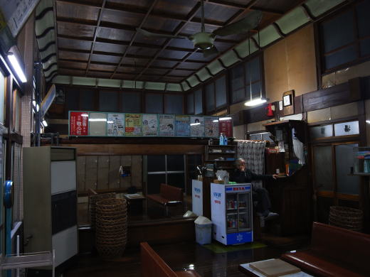 中に入れば、息を飲むレトロな空間がある。幅3間半、奥行3間ほどの広さ。折上げ格天井や 干からびてから長い年月が経つだろう壁材の木目プリント合板。番台も木組みのどっしりとし たものだけど、さほど高級な材料ではないようだ。戦前築の赤羽・玉の湯の建物で育ったせい か「この建物はインチキだから」という大将。インチキという訳ではないだろうけど、新建材 が出始めで、質が悪かったんだと思う。