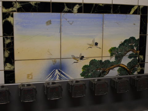 暖簾を潜れば平格天井のさほど広くはないエントランスホール。左右にSakuraG錠の下足箱がある。 そして、番台の背にあたる部分には細やかなタッチの絵付けのタイル絵。しかし、前に置かれた傘 立てのせいで、上の一部分が見えるだけだ。残念・・・。