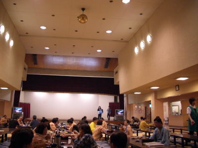 ![]() 最大300人収容の大広間。カラオケが大音量で響いている。 |