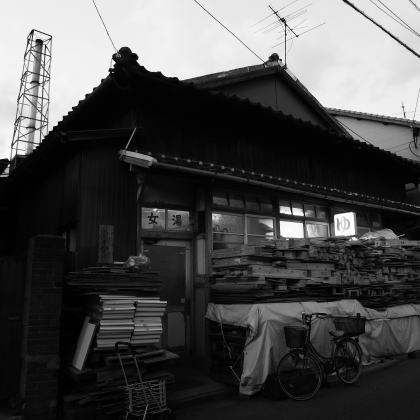さて、鶴の湯。5年前に訪れた時は、定休の日曜で入ることが叶わなかった。奥に油井型の煙突が 見える切妻で板張りという簡素なファッサード。入口は洋風の古い木製のドアで、建物の左右両端 と思えるほどに男・女湯の入口の間隔が開いている珍しい構造。番台の裏にあたる部分に廃材がうず高く積まれ、近づかないと入口が見えないくらいだ。