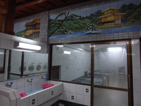 東寺の柳井湯と同じく同湯にも緩衝エリアの浴室入口の上に幅2間半の金閣寺の絵付けタイル がある。平安遷都1200年と記されているものの銘は確認できなかった。女湯は清水寺。柳井湯 のタイル絵と比べて技量としてかなり落差があるかな。