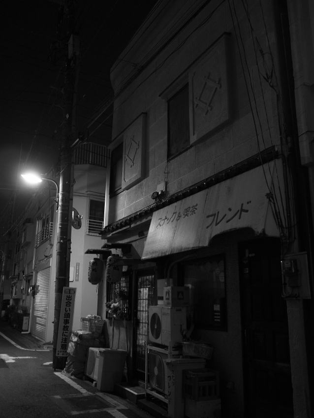 戦後創業という旧鳩の湯。現在は”サウナ”とある四角い煙突を有するマンションの1階のビル銭 湯。マンション1階の張り出した部分は、ガラス張りでコンビニ的な体裁の酒屋になっている。銭 湯の入口が、その店の奥にあるという極めて変わったアプローチ。本来は店の軒にネオンで屋号が 輝き、行灯型の営業案内板や”酒”という看板に灯りが点る仕掛けのようだけど、一切が”節電” している。