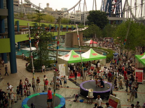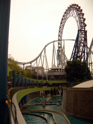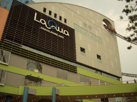 後楽園駅(東京メトロ)を出て、横断歩道を渡るとすぐ新しいラクーアのビル。そして、そのビルを通り抜けるジェットコースターなんかが目に入ってくる。