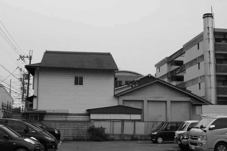 同湯は築80年程度という2階建ての建物。前面の増築部分の奥に、オリジナルと思しき緩い円弧の立体感に乏しい京都風の唐破風が潜んでいる。隣の広い駐車場から眺めると後方にコンクリ造の浴舎が続くのが分かる。