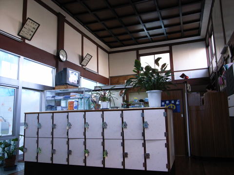 暖簾を潜ると、下足箱の錠は旧型のさくら。入口はアルミサッシの戸に置き換えられている。スライド式ではなく、取っ手を手前に引く方式が珍しい。番台は新建材で前面がカーブしているもの。女将に400円を払う。