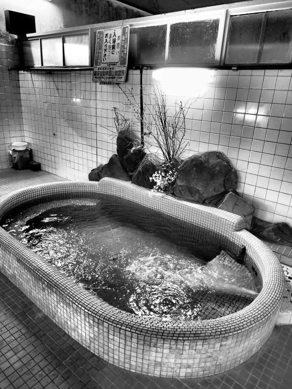 浴槽は、中央に男女境に接するように楕円形の主浴槽が1つだけ。壁側に溶岩が設えられ、造花な がら心得のある女将の手で、桜花が”活けて”ある。やや暗い浴室に実に効果的な演出となってい る。