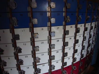 で三色旗のように塗り分けられ、小さなおしどり錠がついている。下足箱もロッカーも基本的