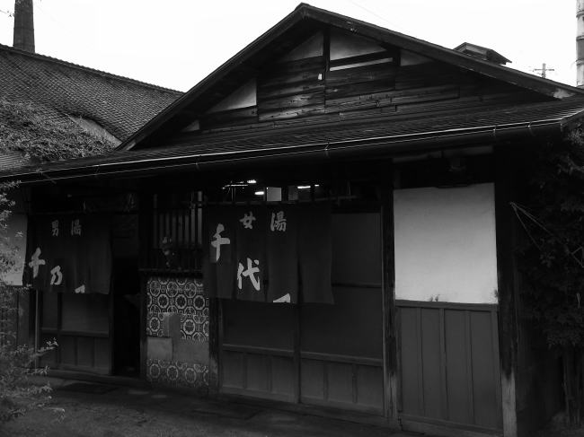 独立したエントランス部分というのはなく、建物の妻面に2枚で構成されるガラス戸が男女そ れぞれにあるのみ。それぞれに「千代の湯」という紺地に白抜きの古びた暖簾が下がる。よく 見ると継ぎはぎだ。番台裏の窓枠に、猿のぬいぐるみがぶら下げられている。客が「去る」と して、銭湯のビジュアルでは嫌われるものなのだが・・・。その下が白磁に紺で模様を描いた 装飾タイル。華やかで絢爛としたマジョリカタイルもいいけど、いぶし銀の同湯にあっては実 に相応しい装飾だ。
