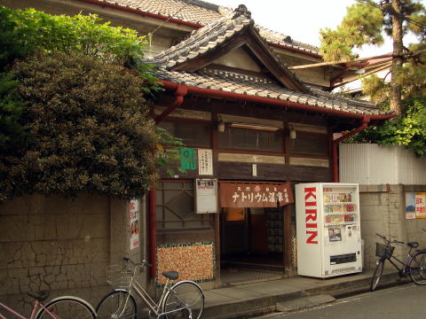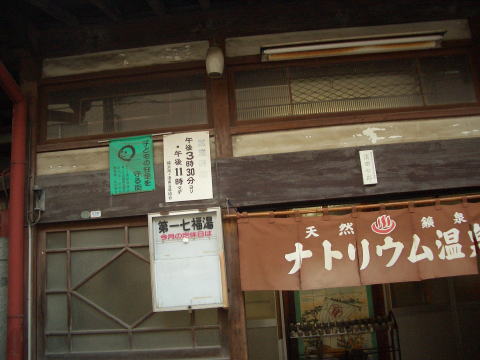 黒湯をイメージしたのか茶色のオリジナル暖簾。「ナトリウム温泉」と大書きされ、隅っこに屋号が書かれている。今は暖簾の上に蛍光灯が点るだけだけど、その両脇に白熱灯の照明器が付いている。銭湯には、蛍光灯よりも電球の暖かい光が似合うんだが・・・。電気代の関係なにかな、みんな蛍光灯に置き換わっている。