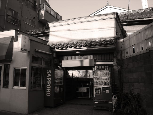 コンクリの煙突が堂々として、エントランス部は古くからの直方体型だ。黒瓦の脱衣所棟が平 入りでその後方にある。案外に風情のある外観と言っていい。