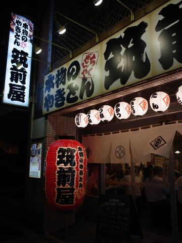 上がりは近くの「筑前屋」という今風のモツ焼き屋。若い人でごった返していた。隣のテーブルの 女性たちを、後ろのテーブルの男連中がナンパしている。煮込みを頼んだらモツしか入っていない。。。 オヤジには少し持て余す店だった。