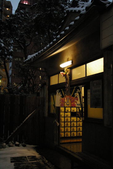 既に路地は綺麗に雪かきがなされ、千鳥破風黒瓦の入口には、正月の注連飾りがかかっている。