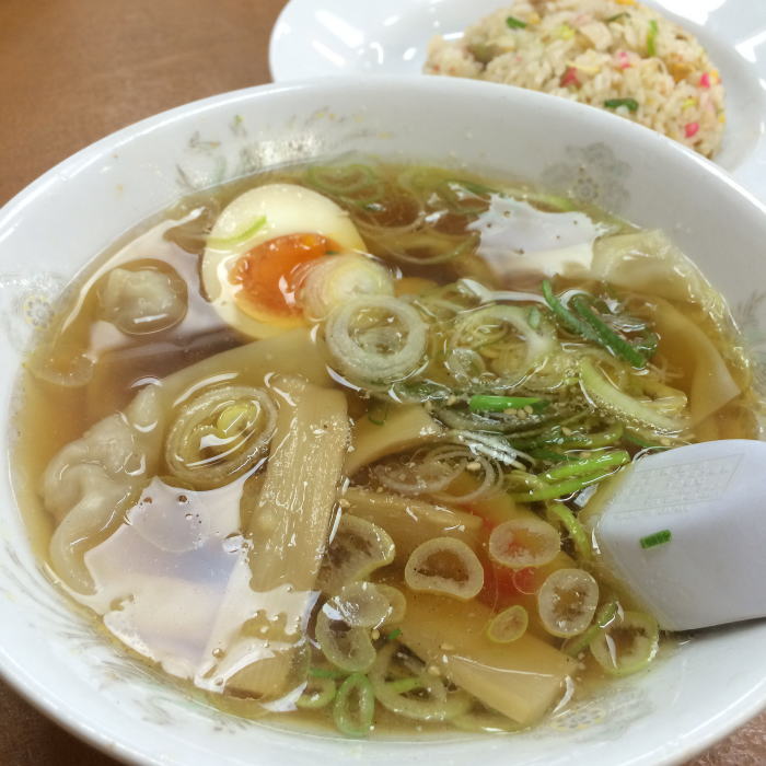 ![]() 煮干しで取った和風の濃い出しのスープだった。ワンタンスープと半チャーハン。 |