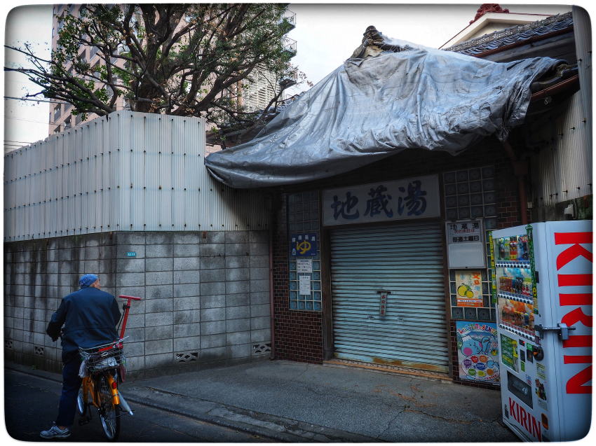 さて、富士の湯。表は増築されているものの、平入りの脱衣所棟に旧エントランスの千鳥破風が残っている。後方には油井型の煙突。昭和20年代初めの航空写真によれば、同湯敷地は畑だった。昭和20年代の開業と推察される。現在の建物はかなりの年季が入っており、手が入ってはいるものの、当時の建物を使っているようだ。