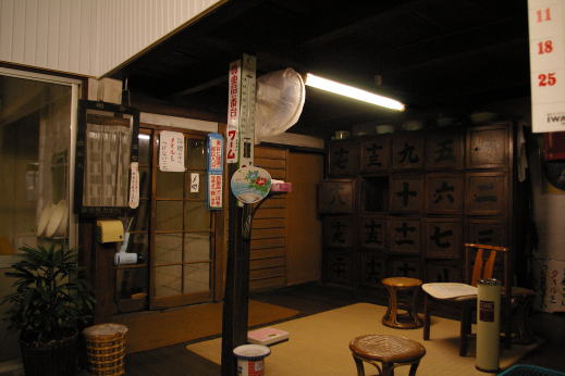 サッシの戸を開けると、畳1枚分もないコンクリのタタキがあって、番台と反対側に下足棚があるのみ。番台は小振りで、下が空洞になっていて、女湯まで通じている。
