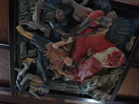 同湯は、銭湯通ばかりでなく、全国区の知名度を持つ銭湯界の巨星だ。 唐破風の見事なエント ランスを有する、築88年の建物のオリジナル部分である脱衣所には格天井とともに見事な彫 刻がある。天井の中央に天狗他のかなり立体的な彫刻がある。このような天井彫刻を他に知ら ない。