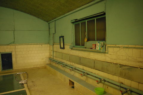 ![]() 主浴槽は幅1.5メートル、奥行1.8メートル、ジェットが2つ。 手前に奥行0.9メートルの浅槽。 窓は塞がれている。 |