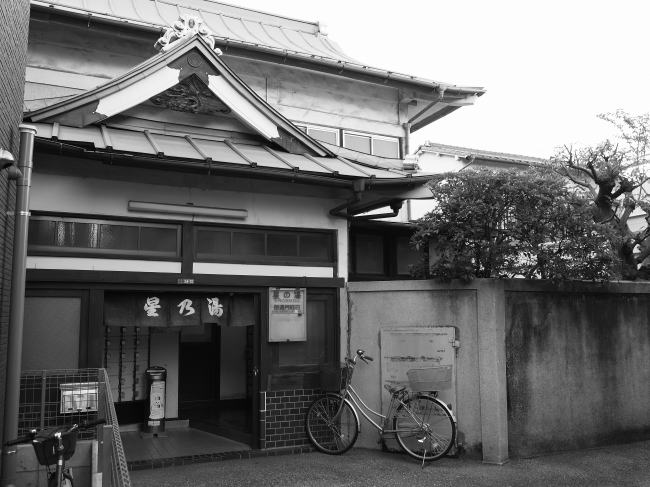 戦前からの銭湯という。現在の建物に建て替わってからも半世紀余りが過ぎている。平入りの黒瓦 を載せた脱衣所建物に、やはり黒瓦の千鳥破風のエントランスが付く。