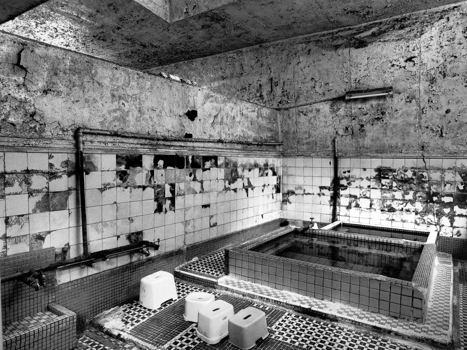 浴室に入る扉の両側には、単にベーシュ四角を群青のタイルで囲むという意匠ながらタイル張りの装飾がある。浴室の広さは横2間、奥行2間半ほど。天井高は2間くらい四角錐型で中央に湯気抜きがある。周囲の壁には白色の古風な風合いの中判のタイルが使われているものの、黴の浸潤が凄く古銭湯独特の景観がある。