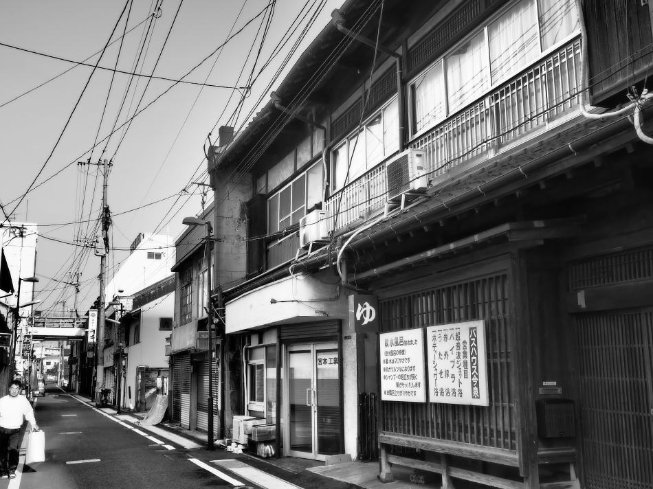 若戸大橋の下の中将湯。道路拡幅があったのか脱衣所棟は建替えられているが、古い写真では洋館風の建物だったようだ。