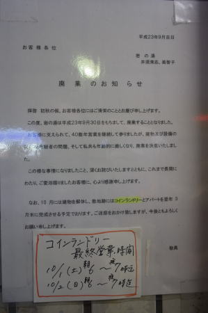あまり廃業の当日に立ち会うことはない。希に立ち会ったとしても、いつもと変わらないのかと思 えるほど、静かだったことが多かったと思う。大泉学園・岩の湯。夫妻の人柄と積み重ねてきた努力なのだろう。記憶に残る貴重な光景を見せてもらうことができた。