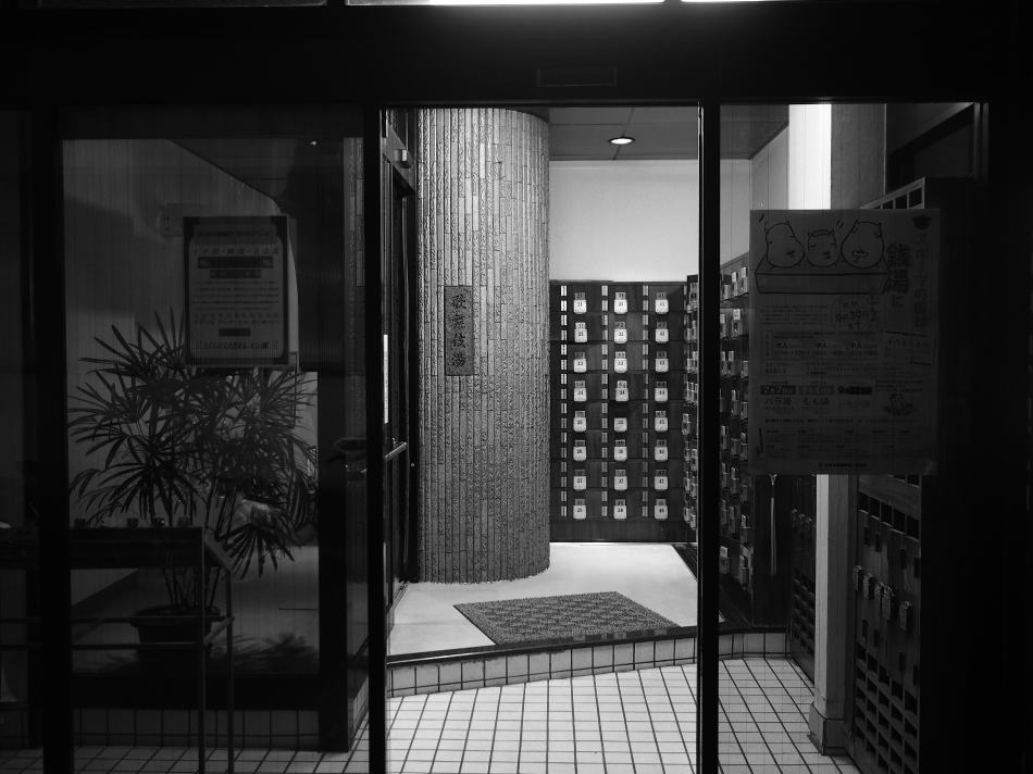 歌舞伎湯は”メゾン飯嶋”というマンションの半地下。下っていく階段の傍らの柱には、御影石に 屋号を彫り込んだ大きな表札のようなものがある。隣湯の白山湯と同様、半地下であるのも旧型さ くら錠の下足箱があるのも同様。全体から感じられる印象も似ている。