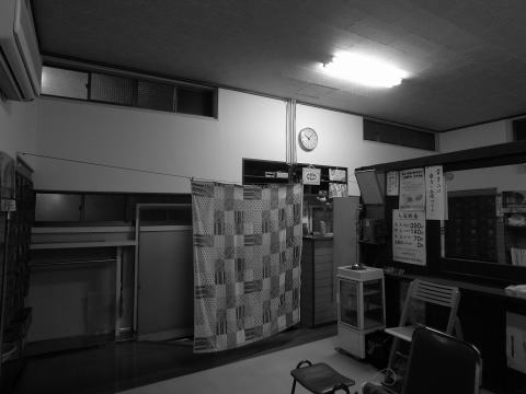 入ればコンクリのタタキに番台。女将に390円を払う。下足箱は番台と反対側に旧型のおし どり錠のものがある。この銭湯で古色蒼然としたオリジナル部分が残るのはこれだけかも知れ ない。それ以外はこま目に更新されているのであまり古いという感じの部分はない。