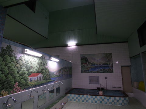 ビジュアルは、奥壁と男女境にモザイクタイル絵。白樺、花、湖、舟、洋館、高峰が描かれた 定番なものだけど、少し細かい作り込みがされている感じがする。さらに、ビジュアルではな いけど、浴槽の外壁側の壁面がモスグリーンの小タイル張りになっている。釜場への戸もセン ター側ではなく外壁側にある。少しずつ変わった部分がある。