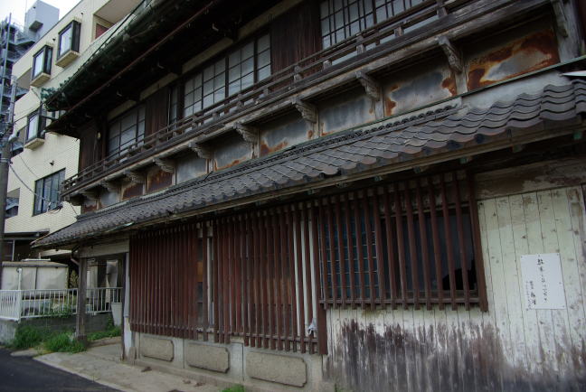 | 船橋・海神遊郭跡(千葉県船橋市海神町) 2007.9.1 「お客さん、しべい、しべい」と声を掛け、「八兵衛」と称された宿場女郎の土地だ。 今も豪壮な妓楼建築が一軒だけ残る。首都圏では貴重な本格的な妓楼建築だ。 駅から離れた旧廓内のエリア。今は住宅地になっている。しかし、「若松劇場」というストリップ小屋と、シャビーな感じのソープランドがあって、遊廓だった名残をとどめている。 |