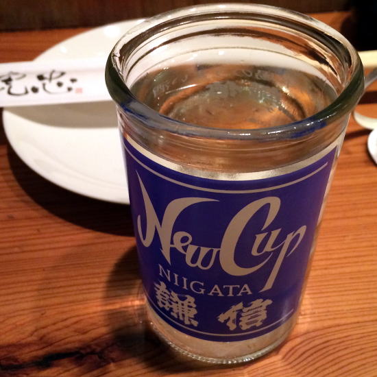 日本酒のワンカップが豊富な焼き鳥屋「虎忠」へ。新潟の清酒のワンカップが30種類。糸魚川の井上浴場を訪れた時に出会った糸魚川・池田屋酒造の「謙信」と再会する。