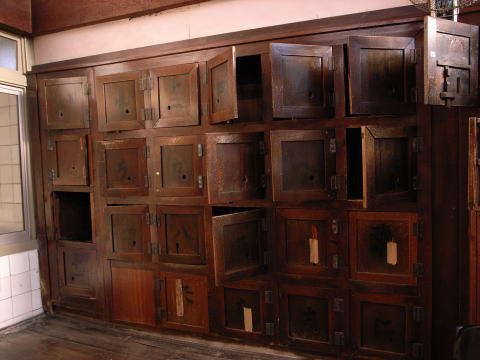 床も見るからに古いもの。外壁側にあるロッカーも、扉の後ろに木製の鍵がある古いもの。物資不足で、金属製の錠が造れなかった時代の物のようだ。