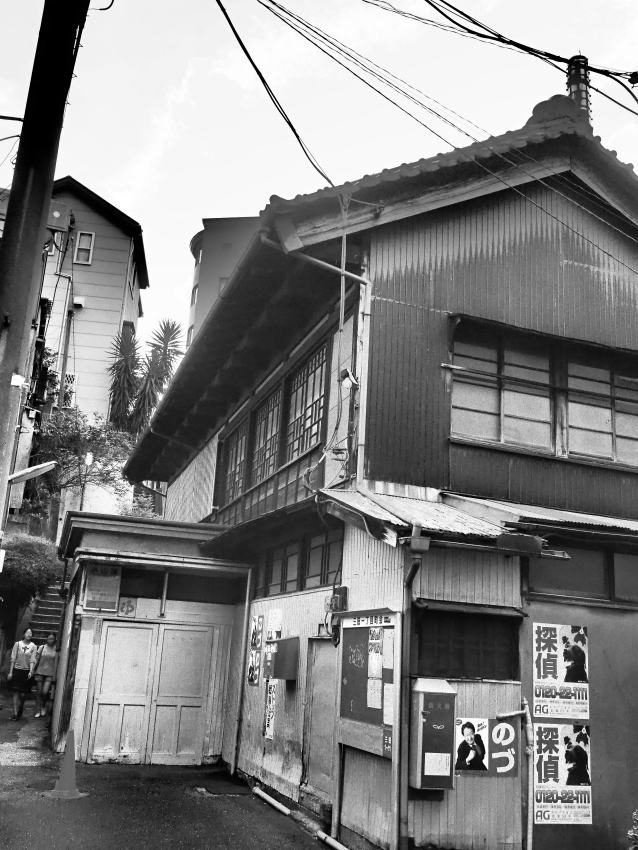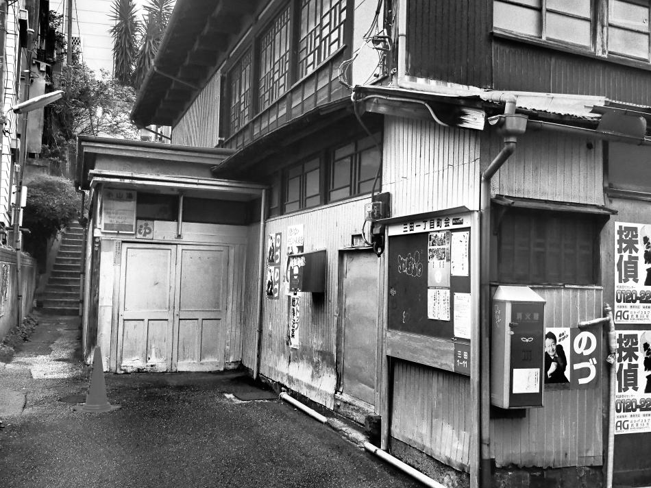 ![]() 商店街から折れた路地の奥に旧小山湯。 この手前の建物との間には木造2階の長屋的な建物があった。 ドン突きの同湯の傍らには、後方の高台に昇る細い階段の道がある。 |