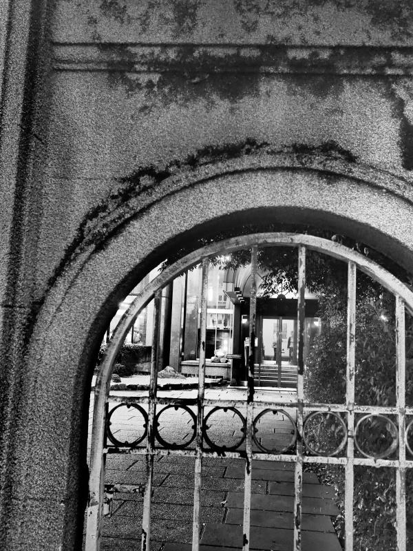 ![]() エントランスの屋根には鉄製の飾りがある。同潤会白河アパート(昭和2年)の階段の手摺りと同様の模様だった。 |