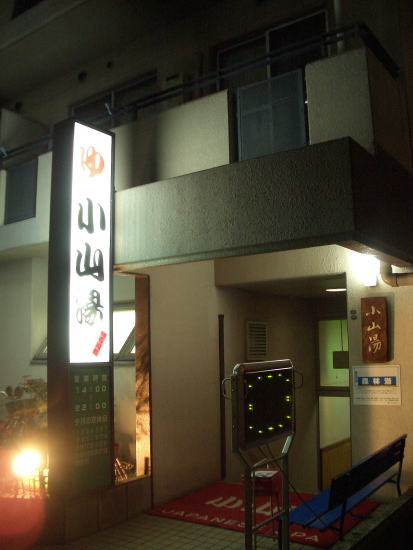 同湯は、元町とは反対方向だけど、「グレース元町」と名乗る1986年築のワンルームマンションの地階に入っている。表に大きく「小山湯」という行灯型の広告看板とともに、入り口脇には屋号を彫り抜いた扁額が掛かっている。