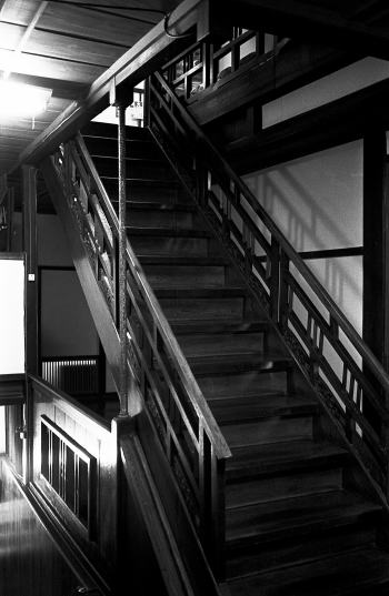 木造3階建て、ハタゴ風の階段の手摺には彫刻が施されていたり、客室の天井はかなり立派な格天井だったり、なかなかの雰囲気。