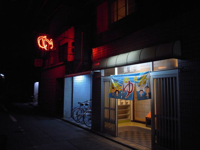 ホテルでひと休みして、仕舞いの時間に近い頃出かける。大通りから一本入った細道。表通りからも分かるように、赤い「ゆ」という大きなネオンサインが道をふさぐように張り出している。
