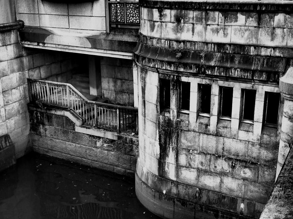 ![]() 橋詰めには今は物置に使われているスペースと川の合流口がある。 船着き場として再活用されているようで、柵の一部がロープに替えられている。 |