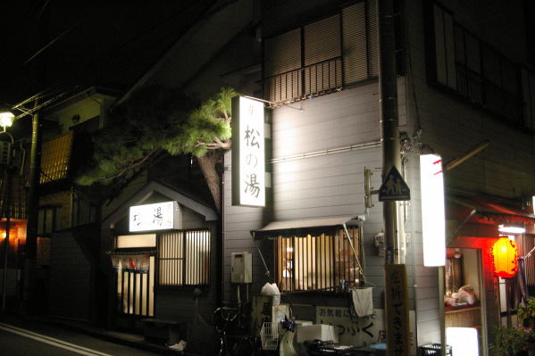 同湯は、大正13年創業。現在の建物は平成8年に建てられたが、見事な枝振りの掛かり松は、創業時からのもの。屋号に因んで松を植えたんだろう。