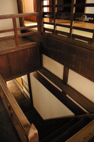 ![]() 芸妓が裾を捲り上げて、この急階段を一気に駆け上がったと言っていた。 |