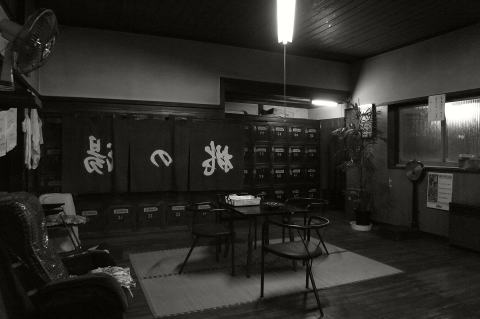 連れが女将さんに高山の銭湯料金計800円を渡す。眼前にイニシエの風景が広がる・・・。脱衣所にあがる。たたきの部分を含め幅3間、奥行3間半。二階があるので板張りの天井はさほど高くはない。