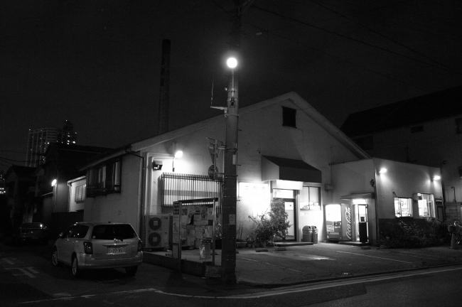 一切の装飾がない実用一点張り、倉庫のような建物。一方、かなり間口の大きな建物で、敷地も広 い。付近は建物が建て込んでいないこともあって、後方のコンクリ煙突も少し高く見える。あるい は、標準的な高さのものより少し高いのかも知れない。
