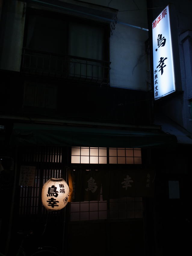 上がりは、行きに目を付けていた、近くの「鳥幸」という焼き鳥屋。”鳥幸/田端”という提灯と、 緑色の洗い晒しの暖簾に惹き寄せられた。入れば、息子と80歳くらいの婆が2人でやっている店。 建具にガムテープの補修があったりする店だけど、先代からの長い歴史を感じる。