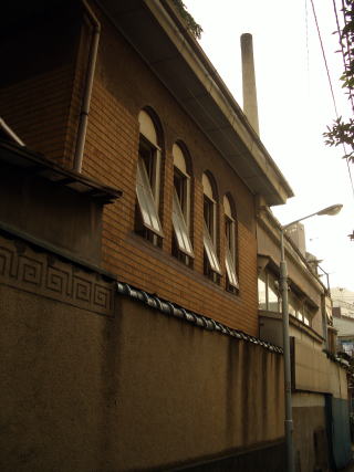 外壁は昭和初年に流行った、縦に引っ掻いた跡があるスクタッチタイルが貼られている。