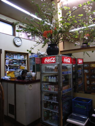 浴室にさほどのビジュアルがないけど、冷蔵庫の上に、女将の見事な活け花がある。何度見ても見事だ。技術的なことは判らないけど、豪壮さではマイベストワン。