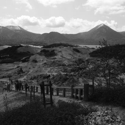 入ったのは「男湯」として使われている「冷抜の湯」と混浴の「花染の湯」。いずれも構造は先に記した通りのシンプルなもの。「冷抜の湯」が参道の傍らにあり参拝者が多く通る場所にある のに対し、「花染の湯」は霊場の外れ、地中から火山ガスが吹き出す荒涼とした風景の中にある。 観光客もここまでは来ない。