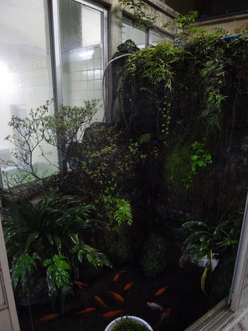 そして、男女境側には築山と金魚が泳ぐ庭池からなる小さな小さな庭(屋外)がある。この庭のさ さやかな幽玄さに心打たれる。溶岩の築山は苔むし、シダなどの草が密生している。折からの雨と 小さな噴水。この小さな”自然”が艶やかに輝いている。畳一畳半ほどのスペース。夕暮れ時で雨 というタイミングもあるのだろうけど、日本人の琴線に触れるかなり素敵な庭だ。