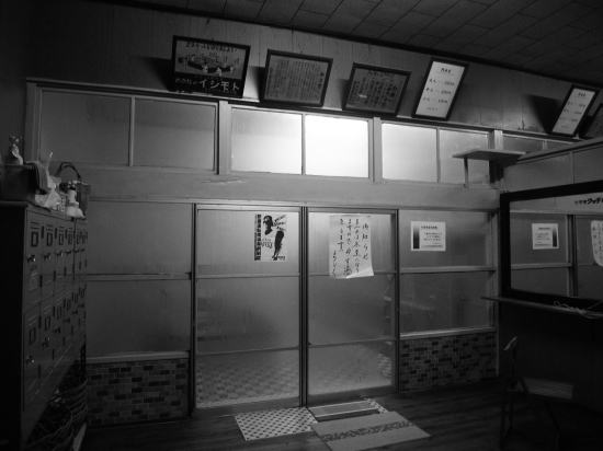 しかし、男女境には黒枠の古い鏡。戦前のものだろう、右書きで「丹頂クラッチ」と記されている。その他、萬國式検眼の張り紙、木製の身長計測器、混浴は12歳までという注意書きなど、古くからの物が垣間見られる。
